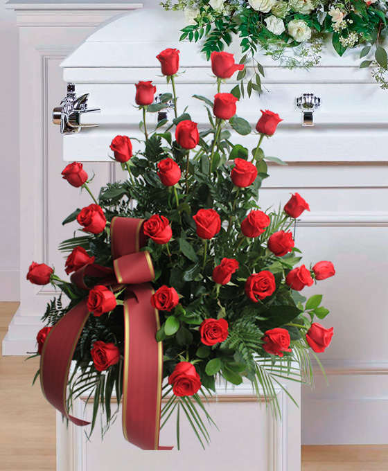 Este Elegante Centro Funerario de 30 Rosas rojas, es un centro de Flores Rojas para Tanatorio Badalona, diseñado con rosas de primera calidad y verdes variados. Desde Coronas Funerarias Badalona disponemos de servicio de envío urgente de flores, así sus Centros Funerarios para Badalona llegarán en el momento oportuno.