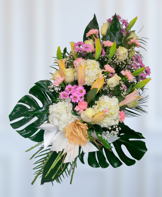 Hacemos envío de centros funerarios de flores, en los principales Tanatorios de Badalona. En ellos nos conocen y saben que las entregas son efectuadas en tiempo mínimo por nuestra parte. Si el cliente lo precisa, también podemos hacer entregas en el Cementerio, así como en domicilios particulares, Iglesias o en cualquier otro lugar de culto que se nos indique. Ramo Funerario tonos Rosa
